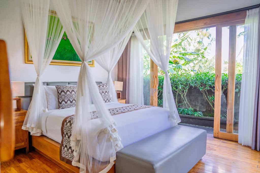 This villa has 2 bedrooms and can fit up to 4 guests. It has a private pool, kitchen, bathroom, garden and river view. There is also AC, a flat screen TV, a terrace, minibar, free Wi-Fi, and free parking.